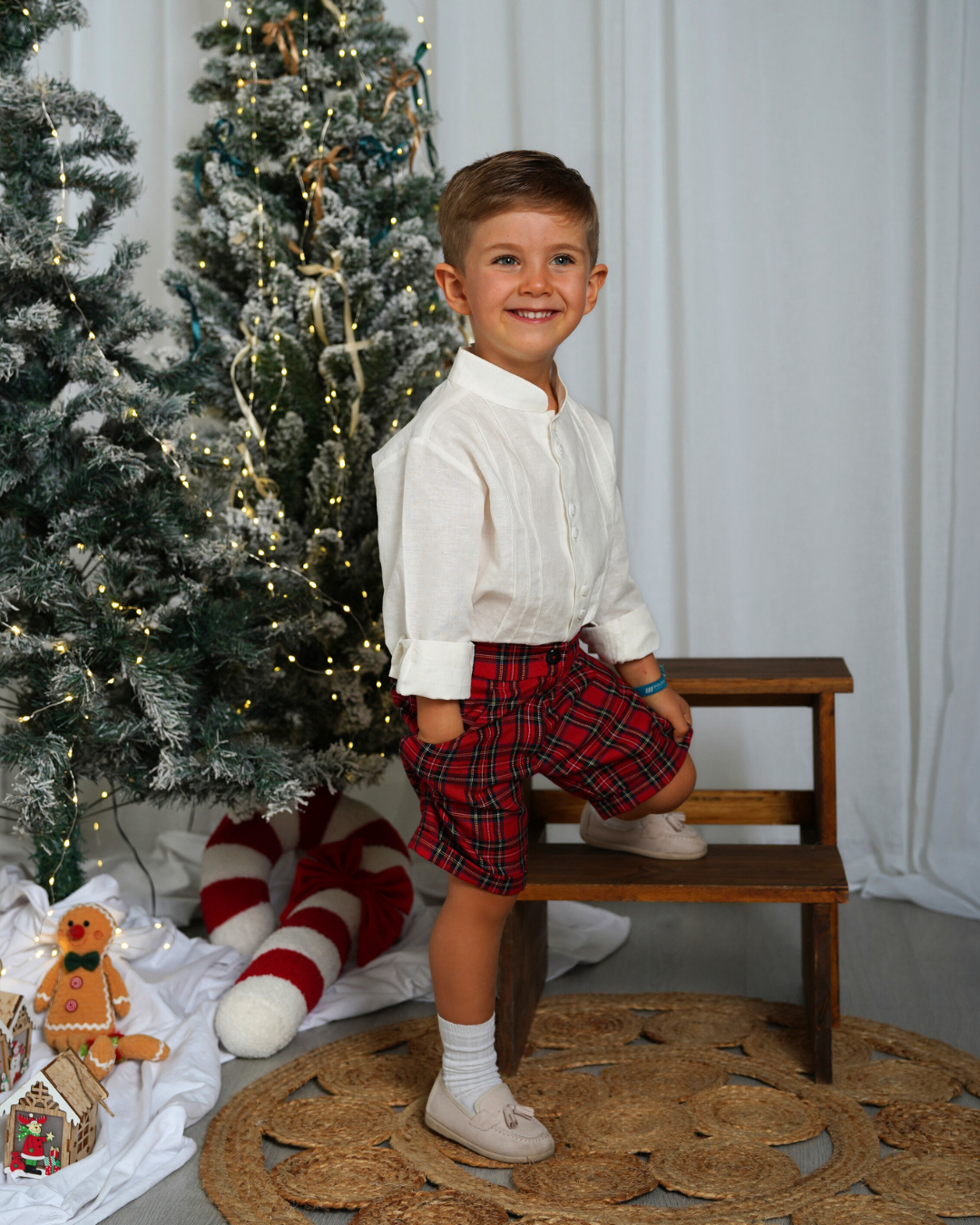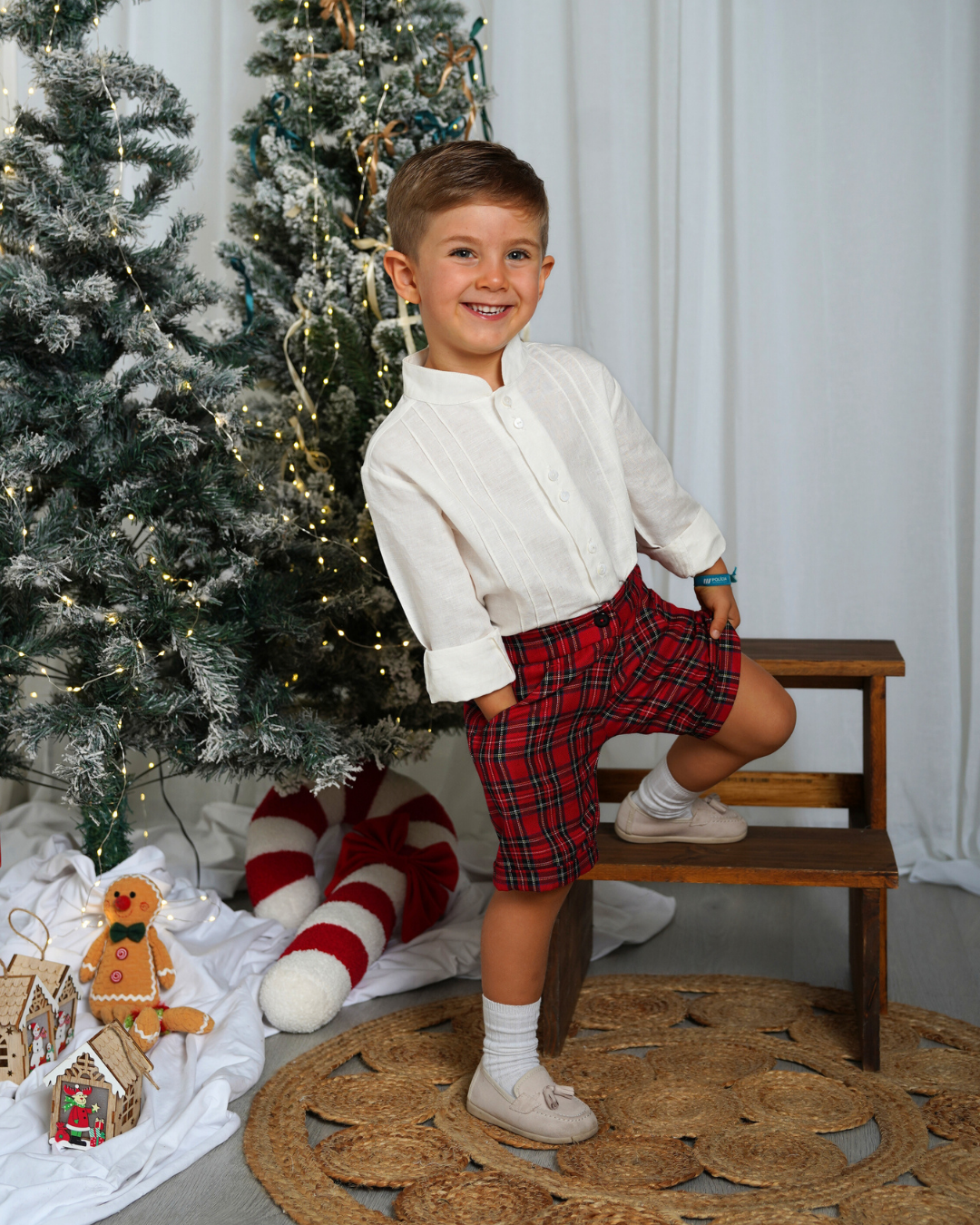 Descrição: calções em tartan xadrez, com fecho, botão e com bolsos. Para conjunto de Natal.