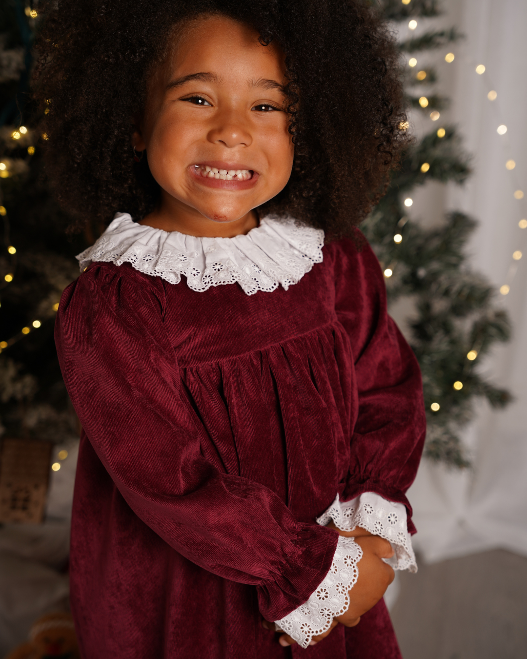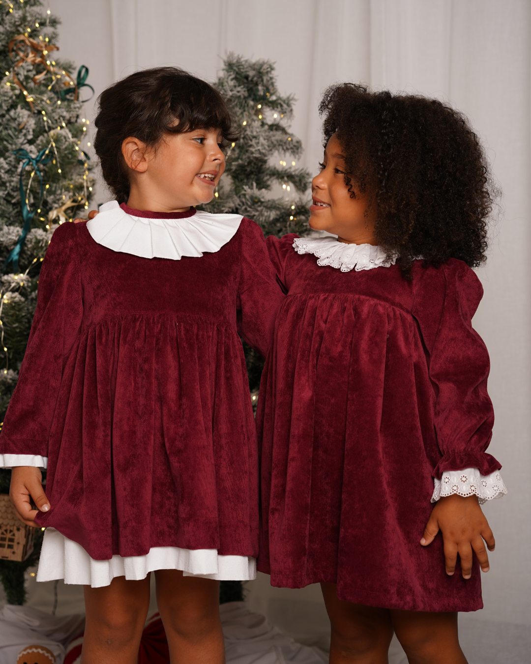 Descrição: vestido em bombazine, com forro de algodão. Gola e detalhe nos punhos em bordado inglês. Com fechos nas costas. Estilo clássico intemporal. Para conjunto de Natal.