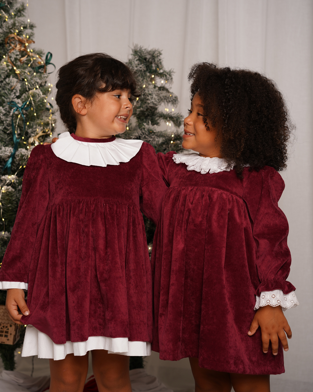 Descrição: vestido em bombazine, com forro de algodão. Gola e detalhe nos punhos em tecido rugoso. Com botões forrados nas costas. Estilo clássico intemporal. Para conjunto de Natal.