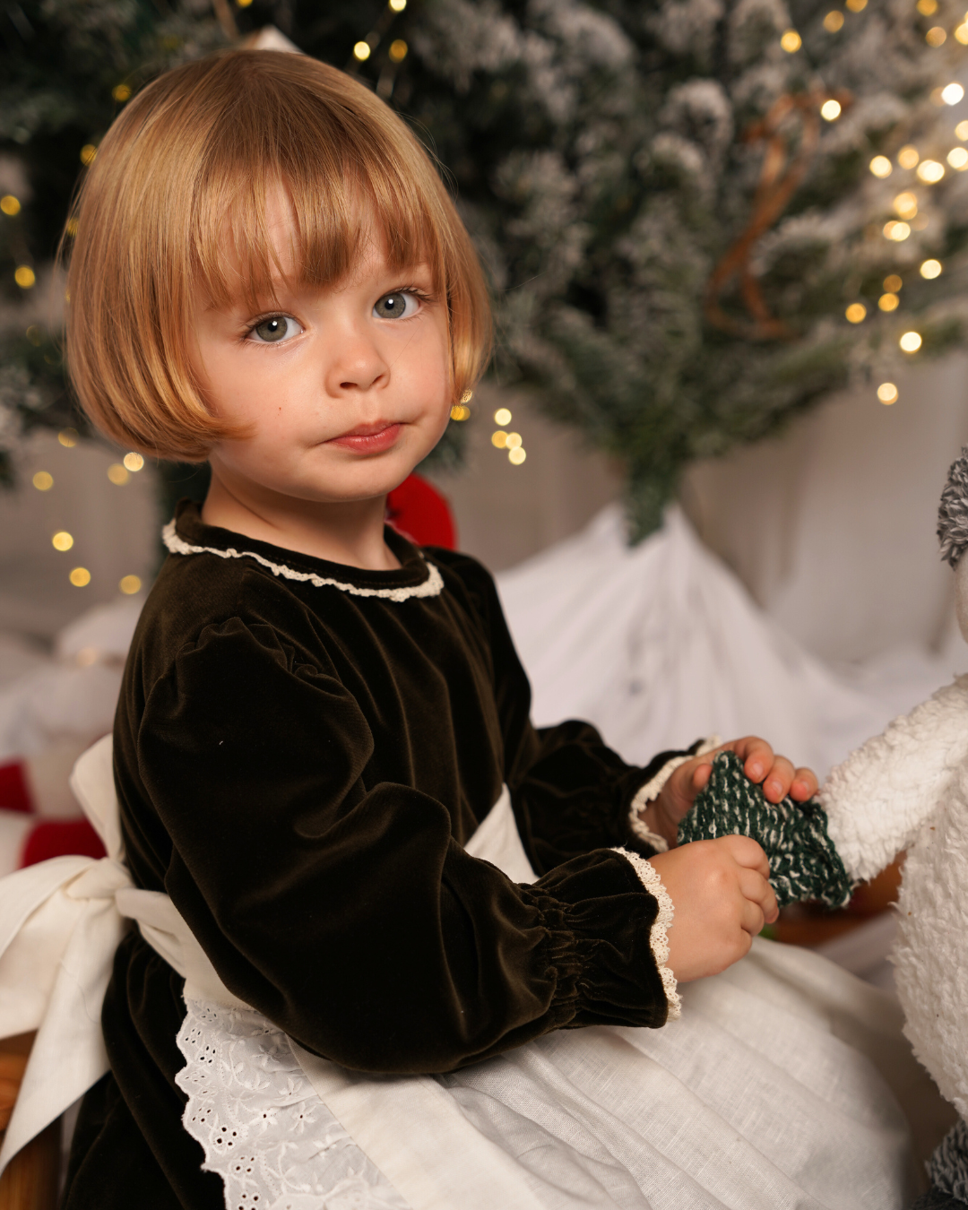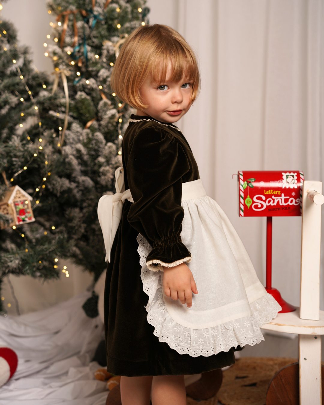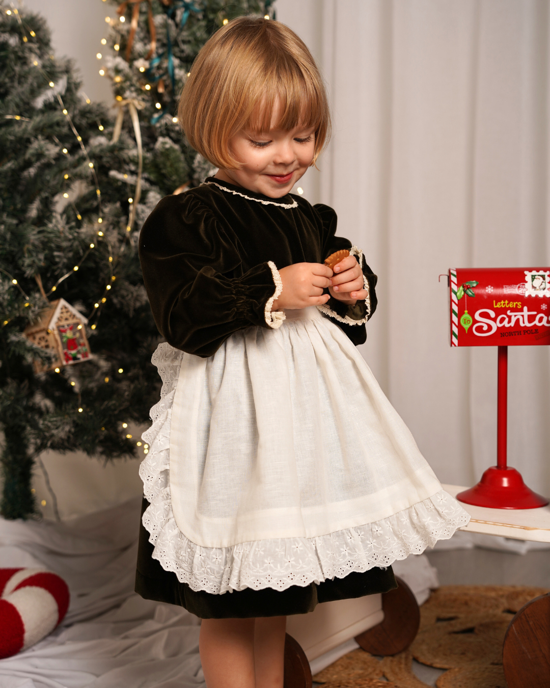 Descrição: vestido em veludo, com forro de algodão. Avental de linho com renda em bordado inglês. Fecho nas costas. Renda delicada na gola e nos punhos. Estilo clássico intemporal. Para conjunto de Natal.